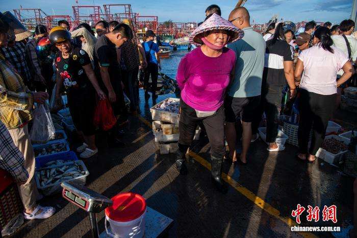 8月17日,大量海鲜从广西北海侨港镇电建渔港上岸,吸引民众争相采购。中新社