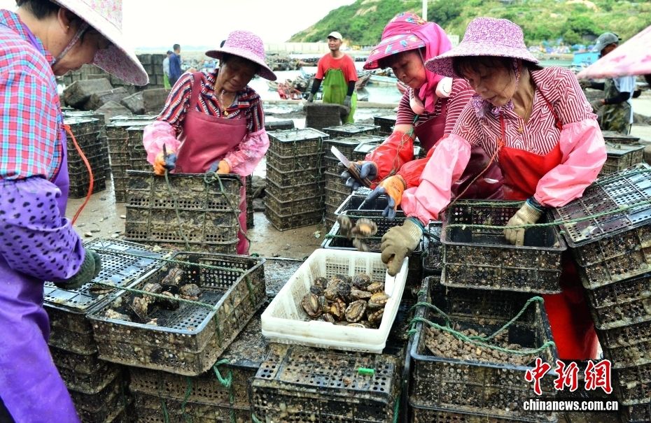 在连江县下宫镇松芦湾码头,渔民分拣上市的鲍鱼。中新网