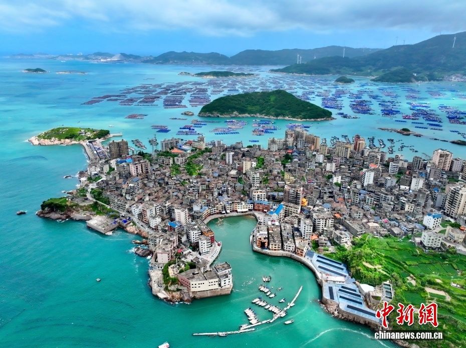 连江县的海上牧场蔚为壮观,养殖网箱在碧波上绵延成片,构成一幅壮阔而富有生机的海上画卷。图为空中俯瞰美丽的渔村。(无人机照片)中新网