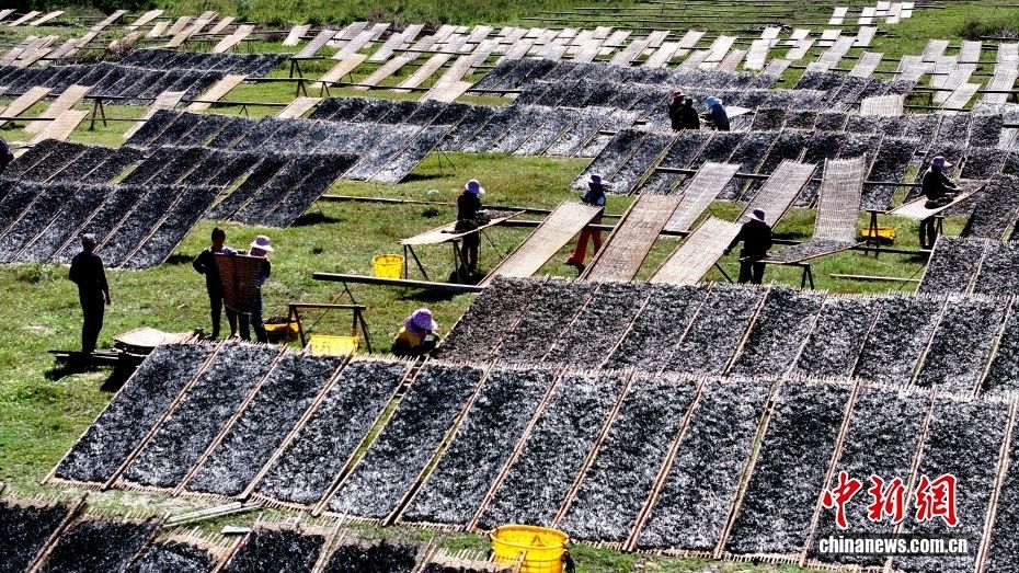 连江县浦口镇垦区新村的村民在忙着晾晒刚采收的鲜紫菜。中新网