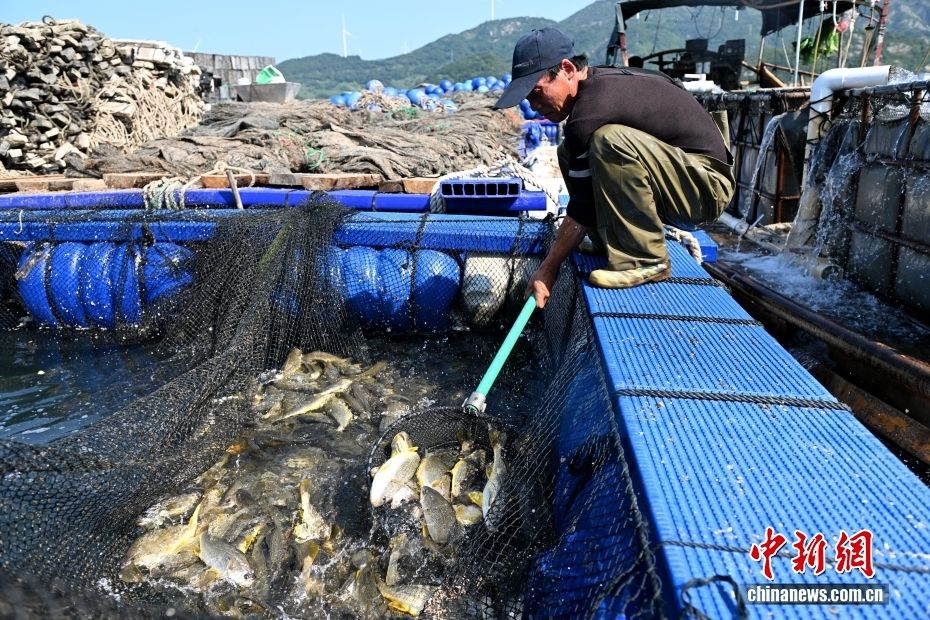 在连江县奇达村的海上养殖场,渔民正在捕捞海鱼。中新网