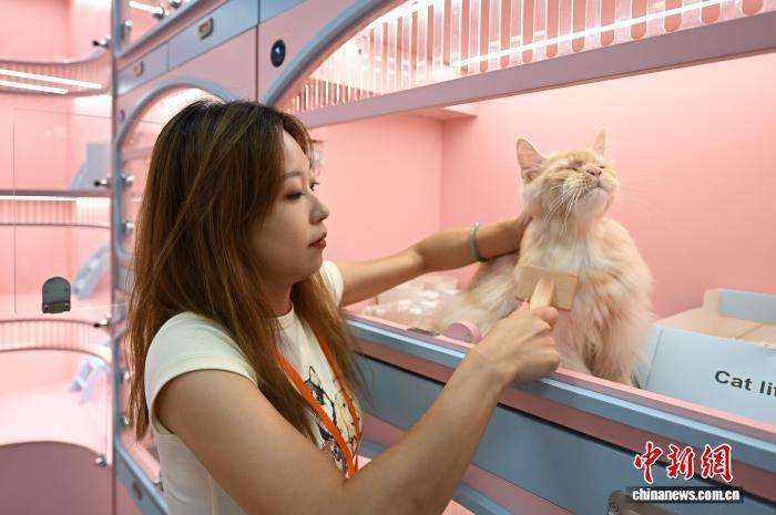 8月28日,工作人员为宠物猫梳毛。中新网