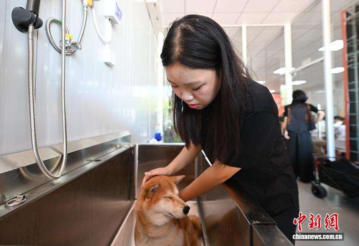 8月28日,工作人员准备为宠物狗洗澡。中新网
