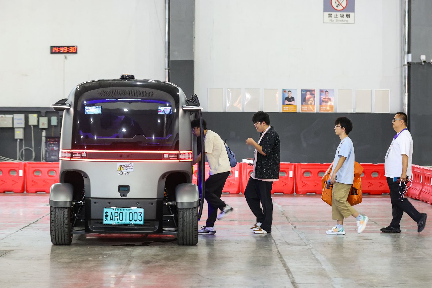 参观者排队体验无人驾驶汽车。中新社