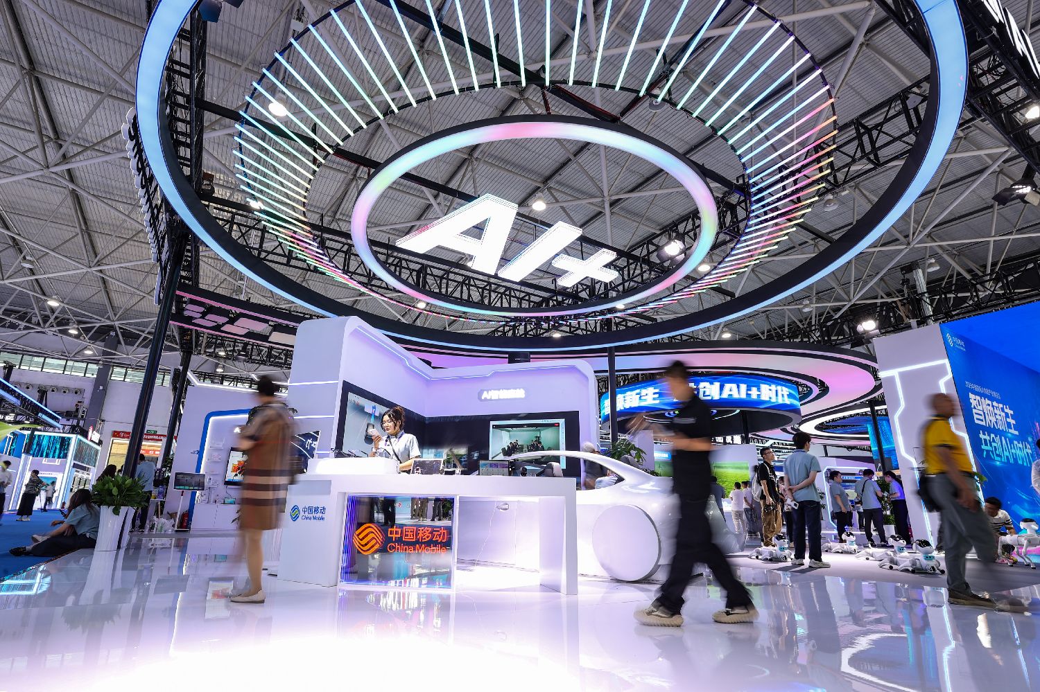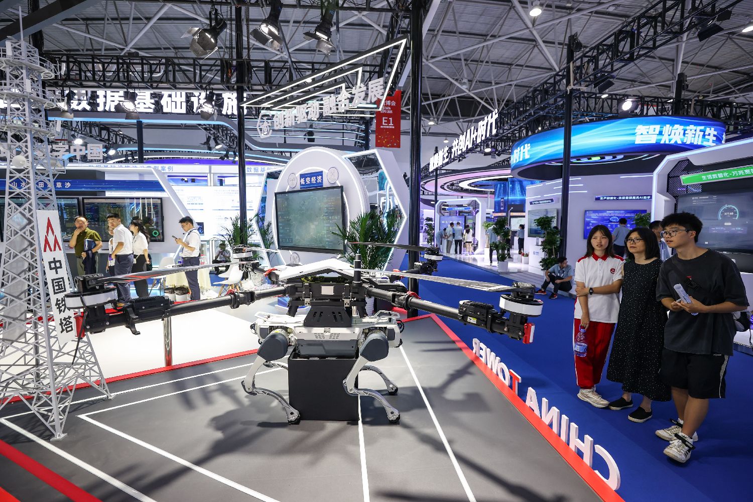 中国铁塔展区的“机器狗+无人机”组合巡检设备吸引参观者。中新社