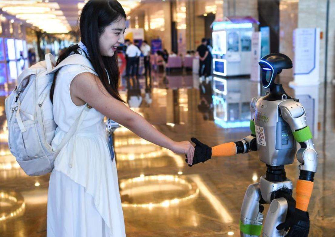 参会人员在2025中国国际大数据产业博览会开幕式现场与一款机器人互动。新华社