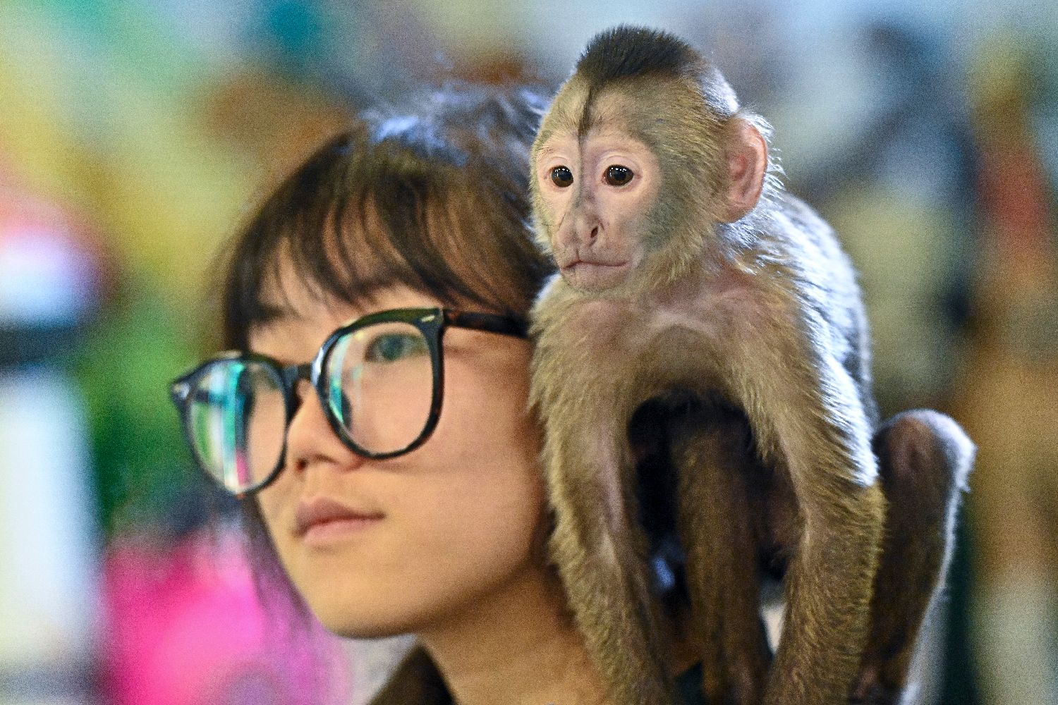 9月1日,广州长隆野生动物世界举办“幼儿园开学”动物科普活动,白颊长臂猿、黑带卷尾猴等多种灵长类动物幼崽集中亮相,向游客展示灵长类动物保育成果。图为黑带卷尾猴幼崽“芋头”依偎在保育员肩膀上。中新社