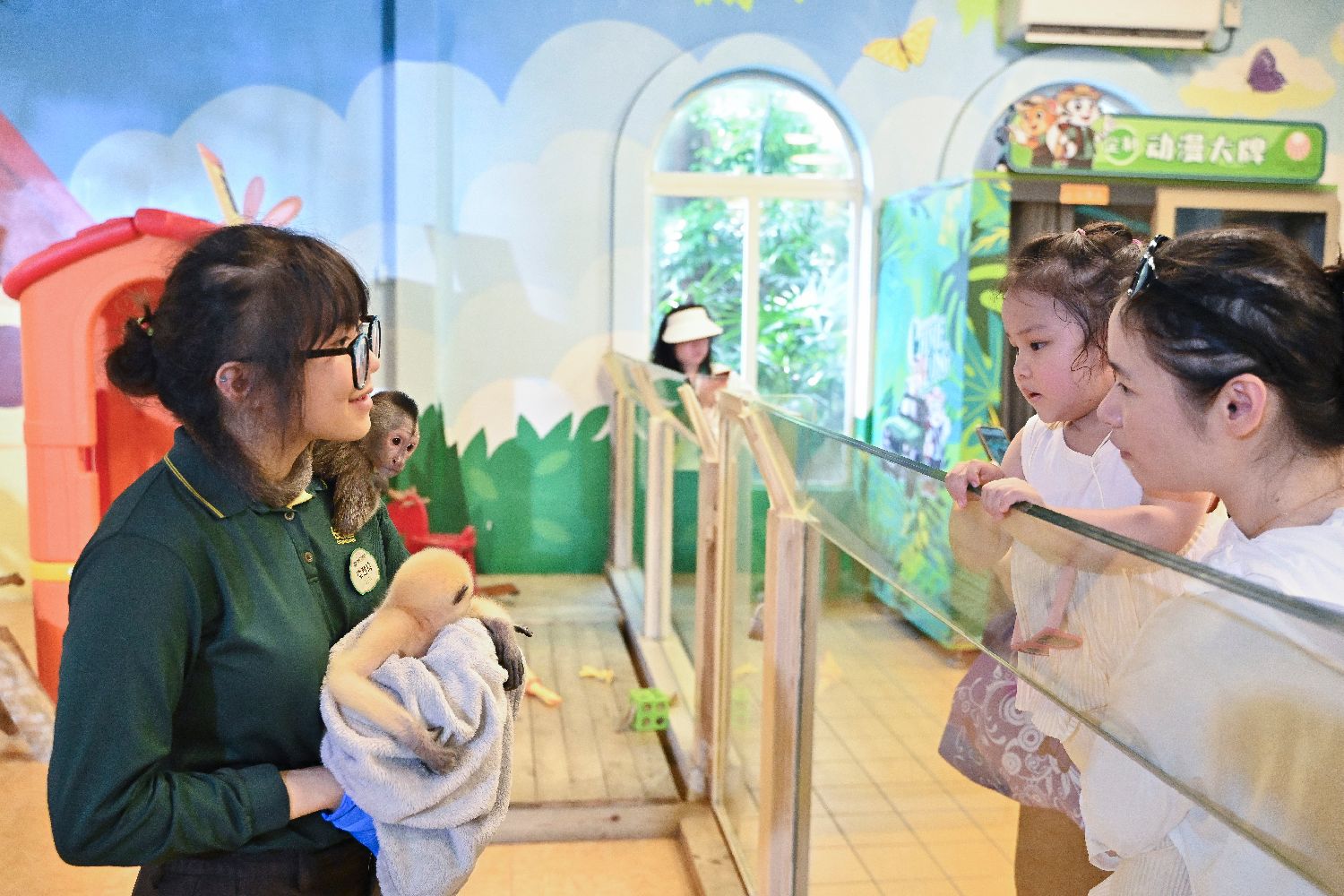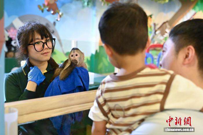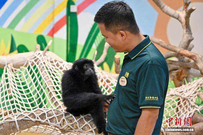 保育员向游客介绍黑带卷尾猴幼崽“芋头”。中新网