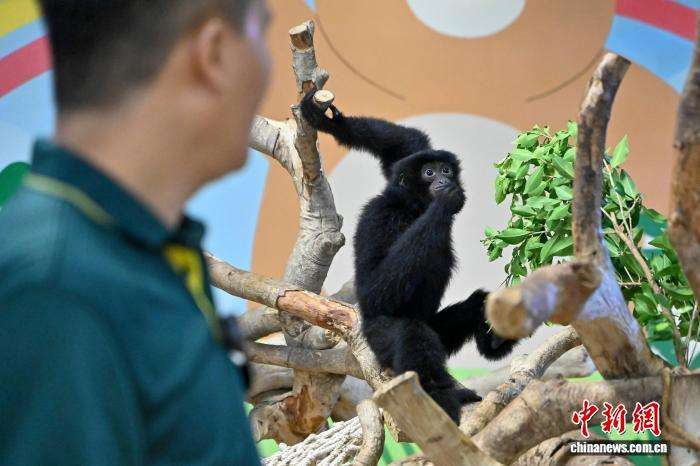 合趾猿幼崽“华Dee”与保育员互动。中新网