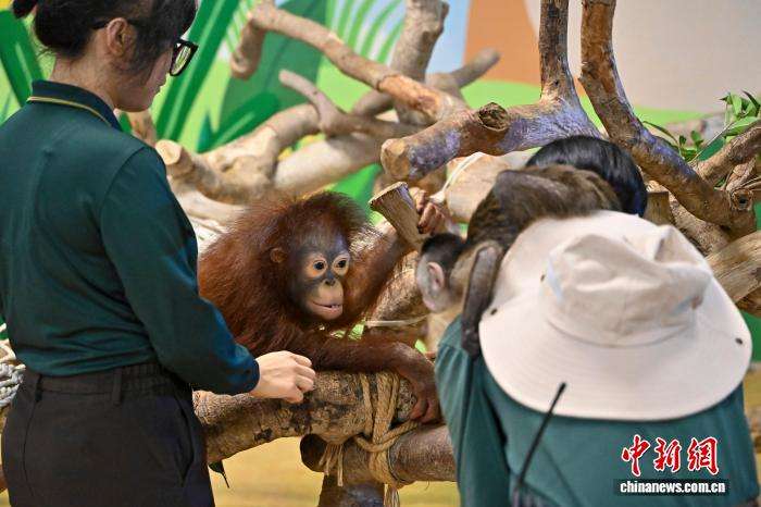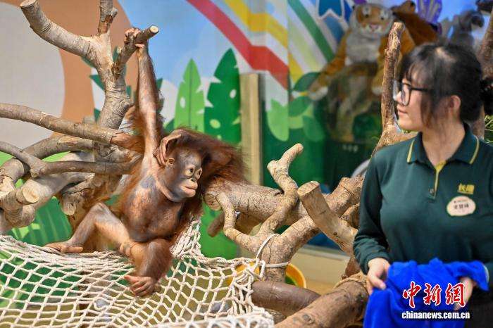 红毛猩猩幼崽“丝瓜”与保育员互动。中新网