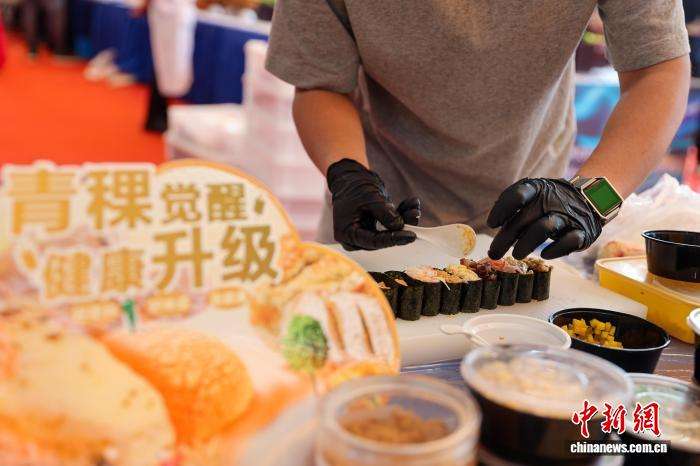 工作人员现场制作青稞寿司。