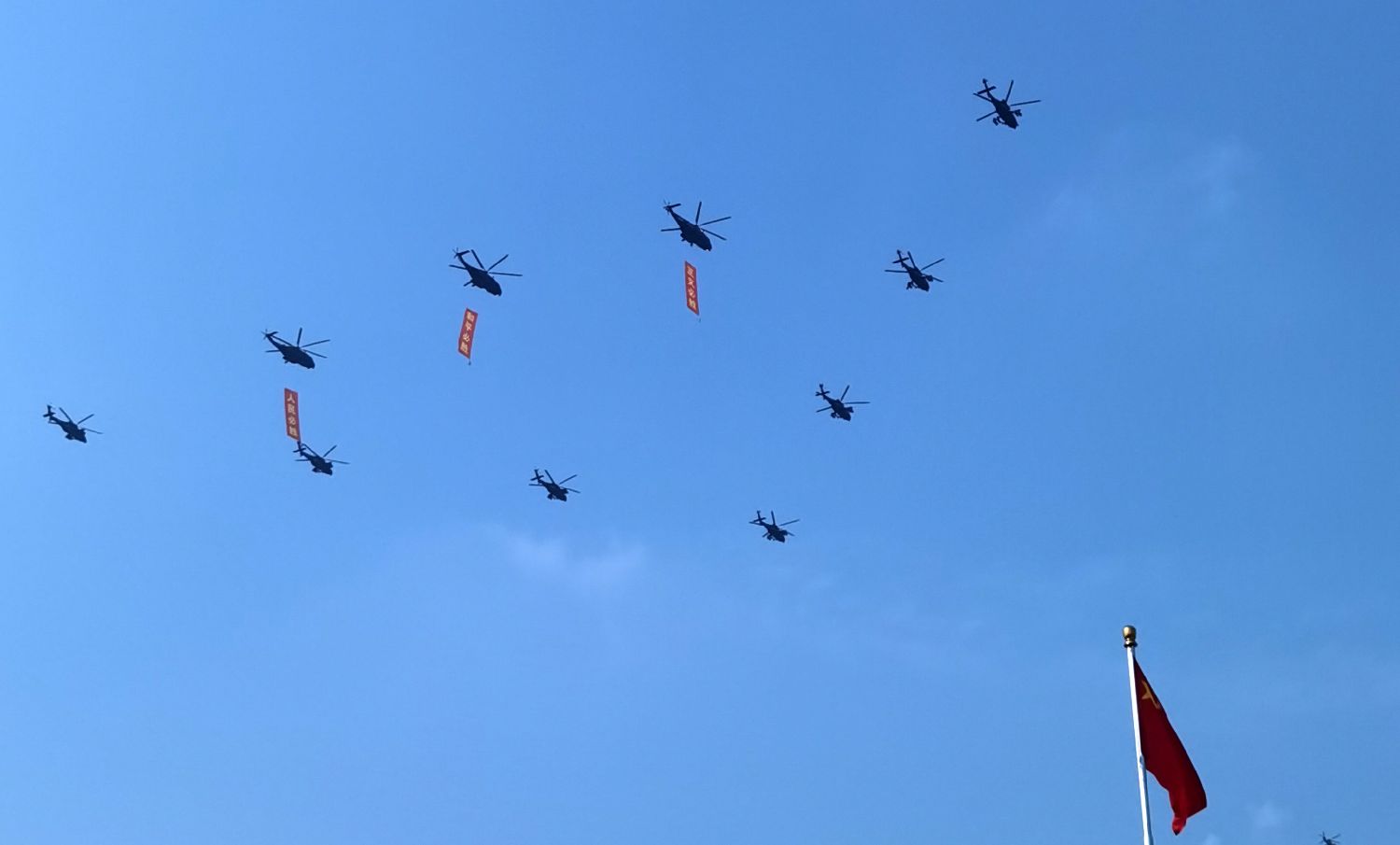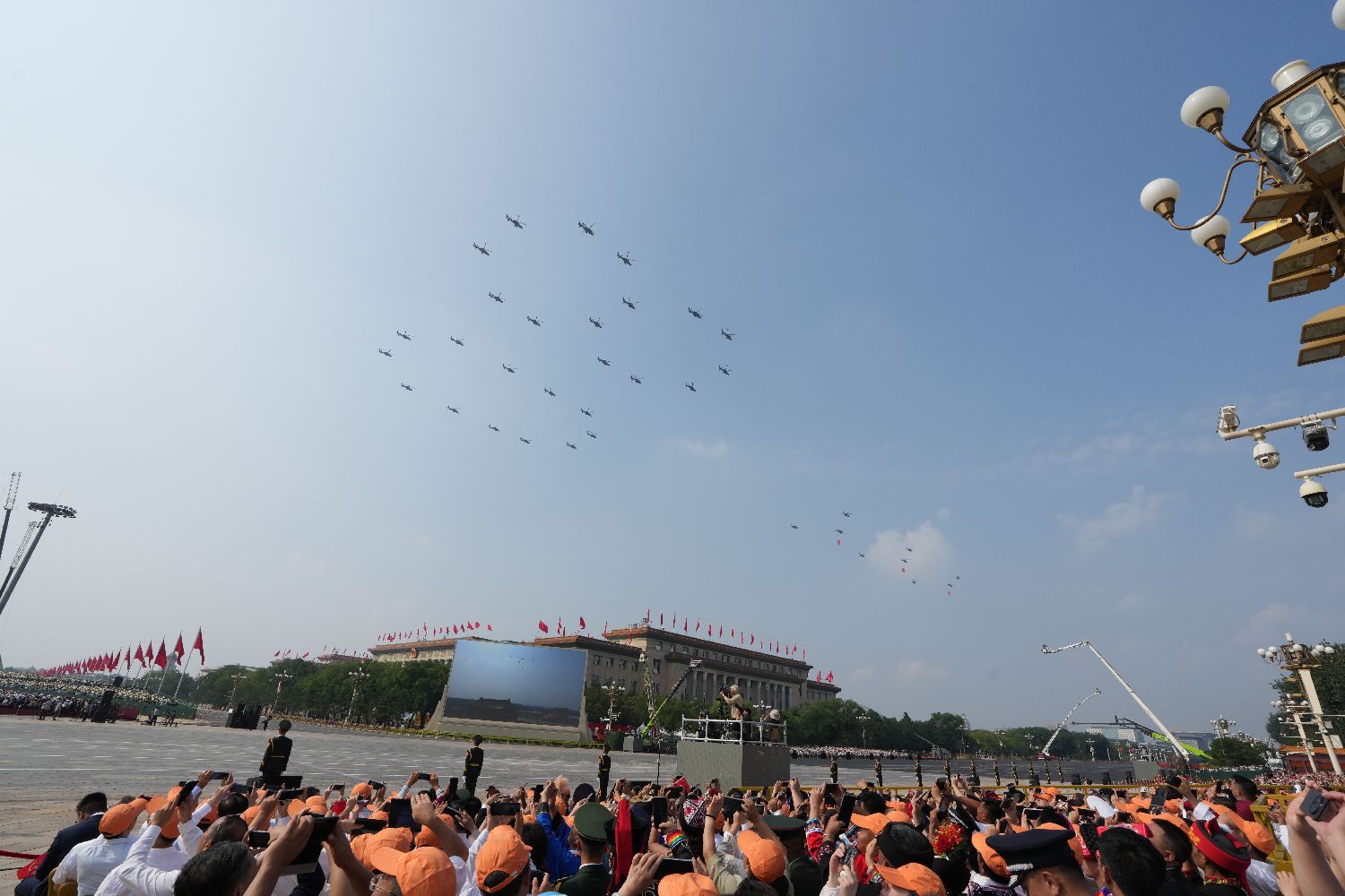 空中护旗梯队飞过天安门广场上空。