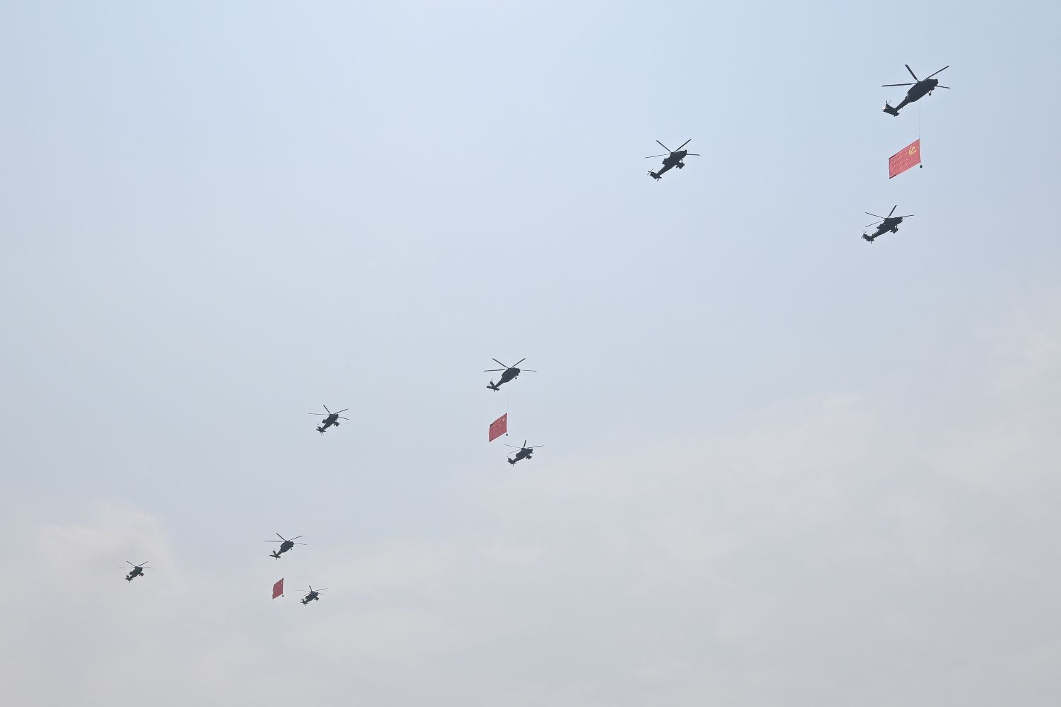 9月3日,纪念中国人民抗日战争暨世界反法西斯战争胜利80周年大会在北京隆重举行。图为空中护旗梯队飞过天安门广场上空。