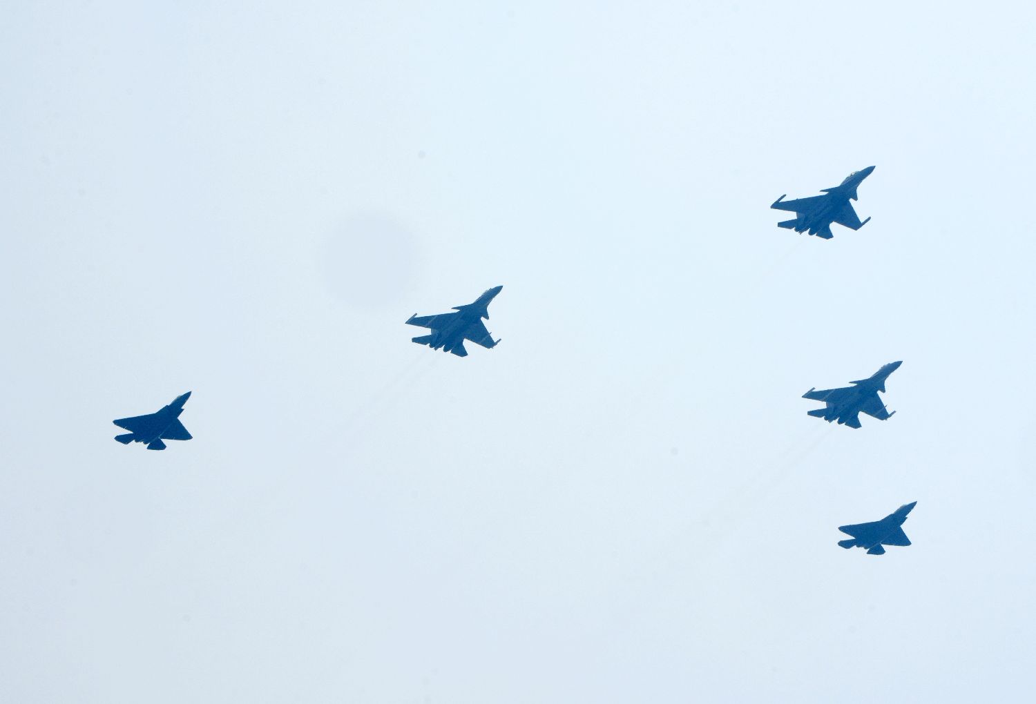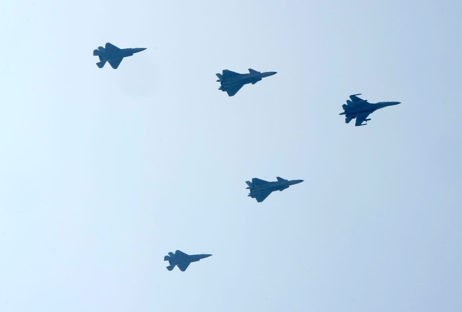 歼击机梯队歼-16、歼-20和歼-35(从右至左)编队飞越天安门广场。