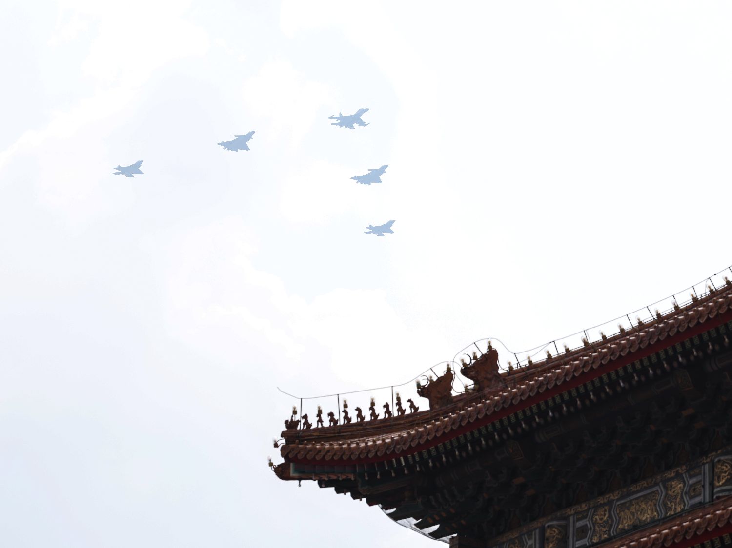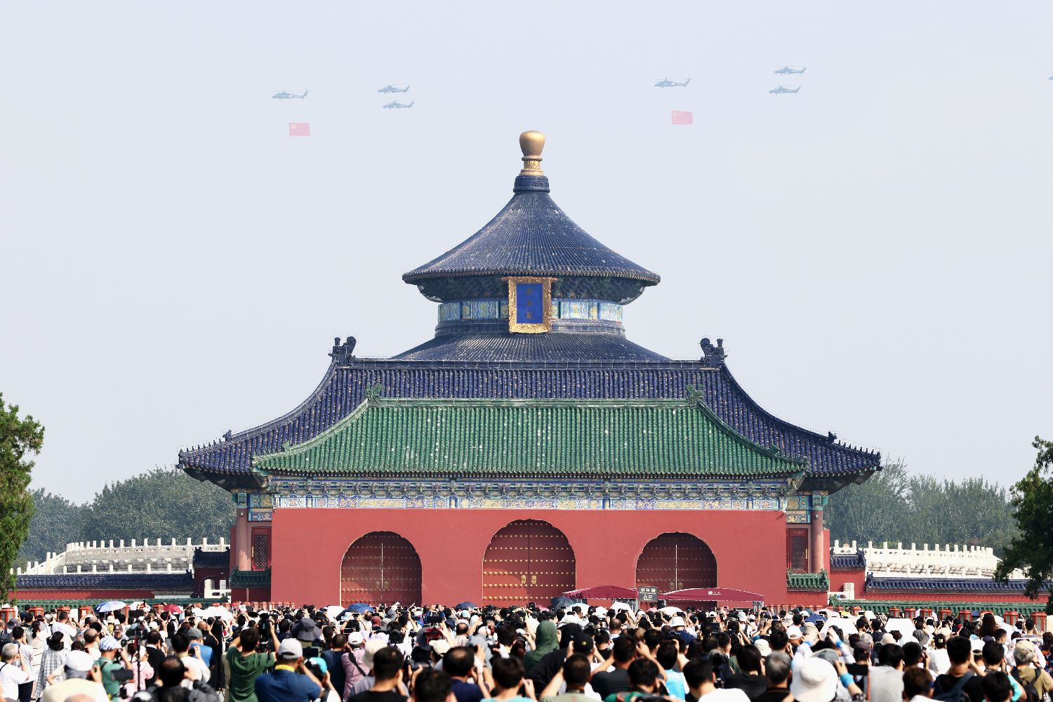 空中护旗梯队飞过天坛上空。
