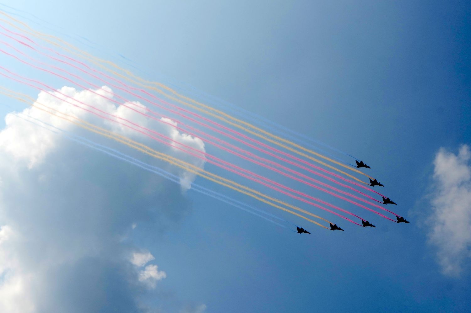 本次阅兵,空中方队由5架教-10飞机、5架歼-10S飞机、7架歼-10表演机组成的教练机梯队压轴出场,接受检阅。图为教练机梯队飞越天安门广场和长安街。