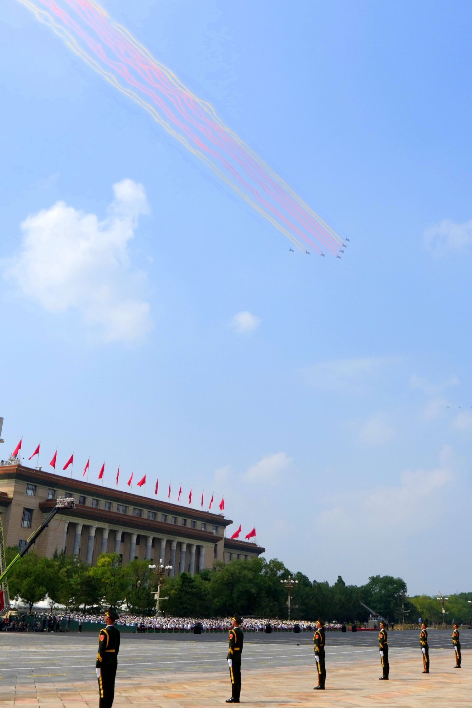 空中梯队飞过天安门上空。