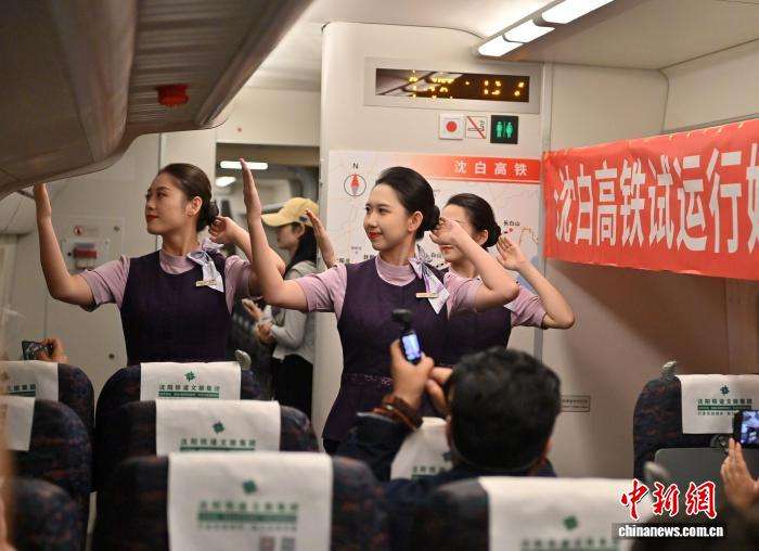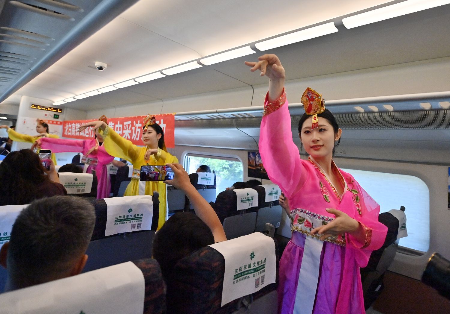 9月4日,沈佳高铁沈白段开始模拟载客试运行。作为中国东北高铁网重要组成部分,该线路对畅通区域经济循环、促进沿线旅游资源开发等具有重要作用。图为列车工作人员表演朝鲜族舞蹈。中新社