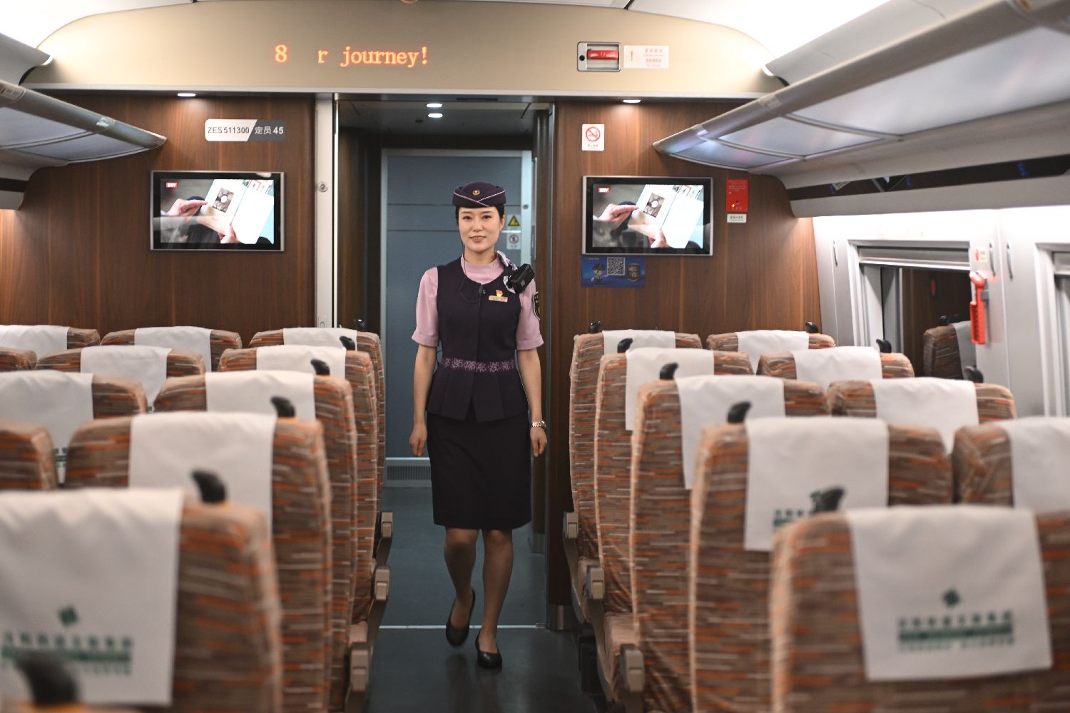 G9121次列车长顾晓凤在巡视车厢。中新社