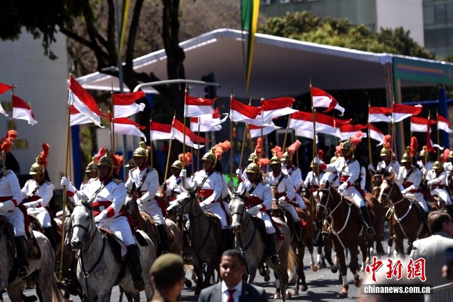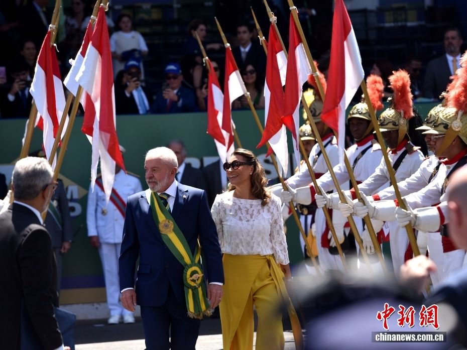 9月7日,巴西独立203周年庆典活动在首都巴西利亚举行。巴西总统卢拉当天检阅了参加阅兵式的巴西海陆空三军、装甲部队、宪兵、联邦警察、消防部队和飞行表演队,并观看了社会各界组织的游行活动。图为巴西总统卢拉和夫人罗桑热拉参加独立日阅兵式。