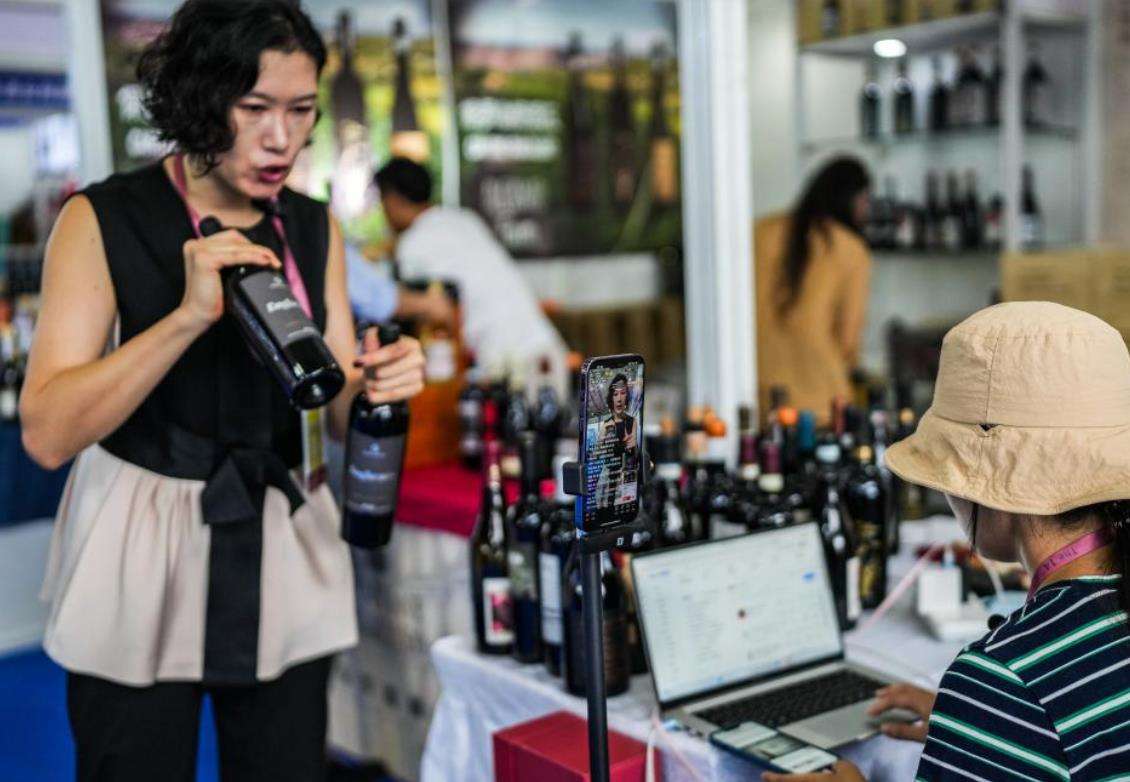 9月9日,第十四届中国(贵州)国际酒类博览会在贵州省贵阳市拉开帷幕。此次酒博会为期5天,以“汇全球佳酿 促开放合作”为主题,吸引来自全球40多个国家和地区的企业参展,集中展示超过20000款酒类产品。图为9月9日,参展商在酒博会现场直播。