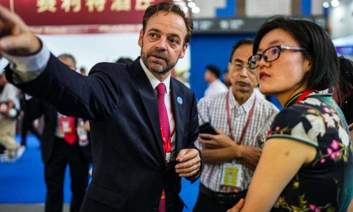 9月9日,参展商在酒博会现场洽谈业务。