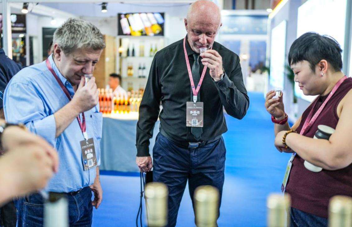 9月9日,参展商在酒博会现场品酒。