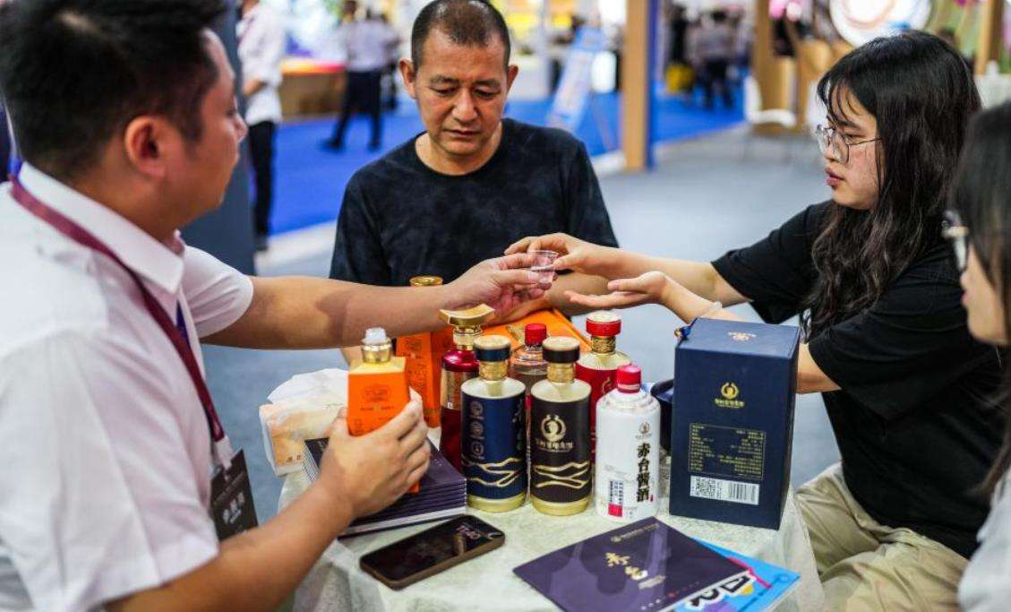 9月9日,参展商在酒博会现场向消费者推介酒类商品。