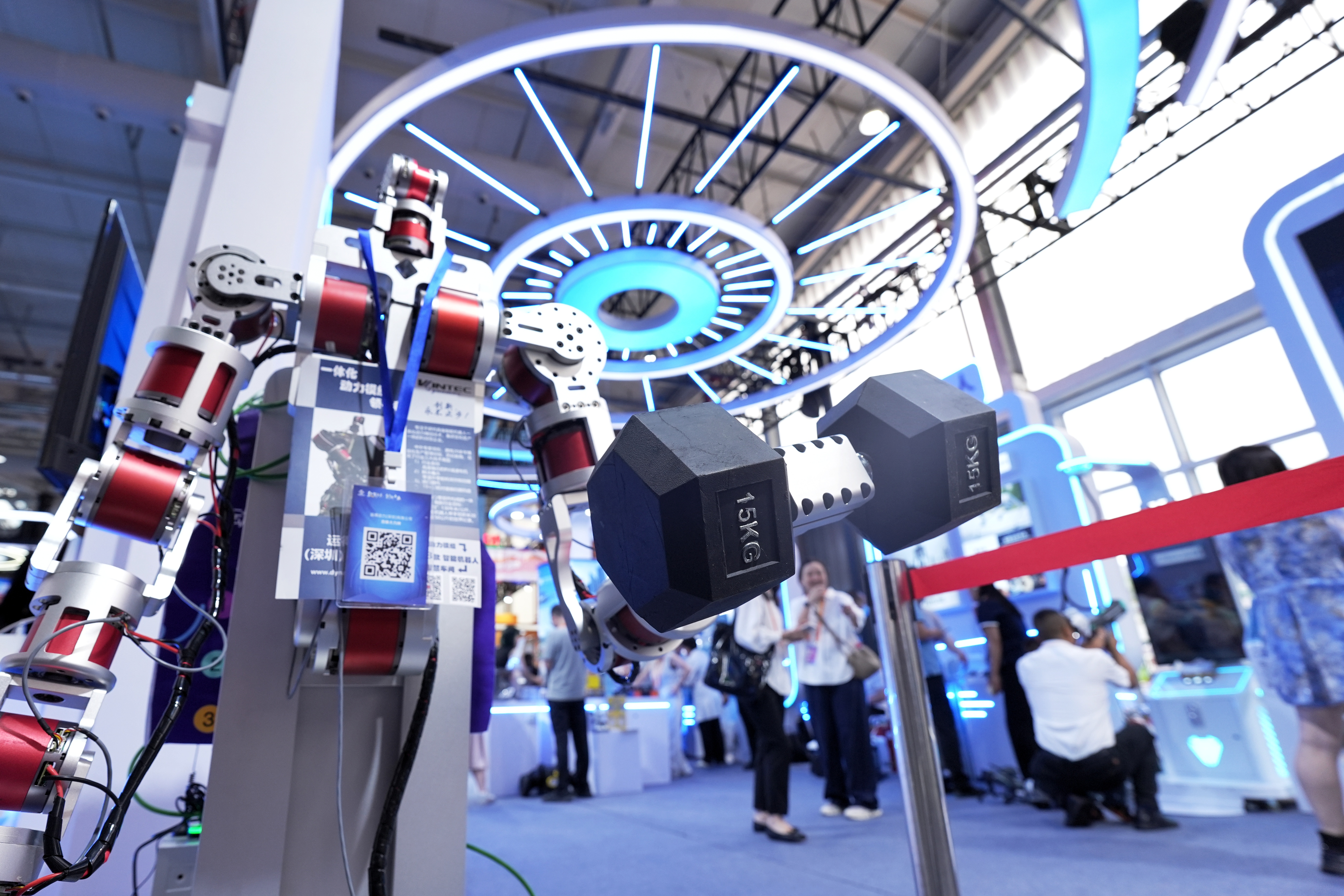 在广东展馆,一台广东企业生产的机器人举起15KG的哑铃。中新社