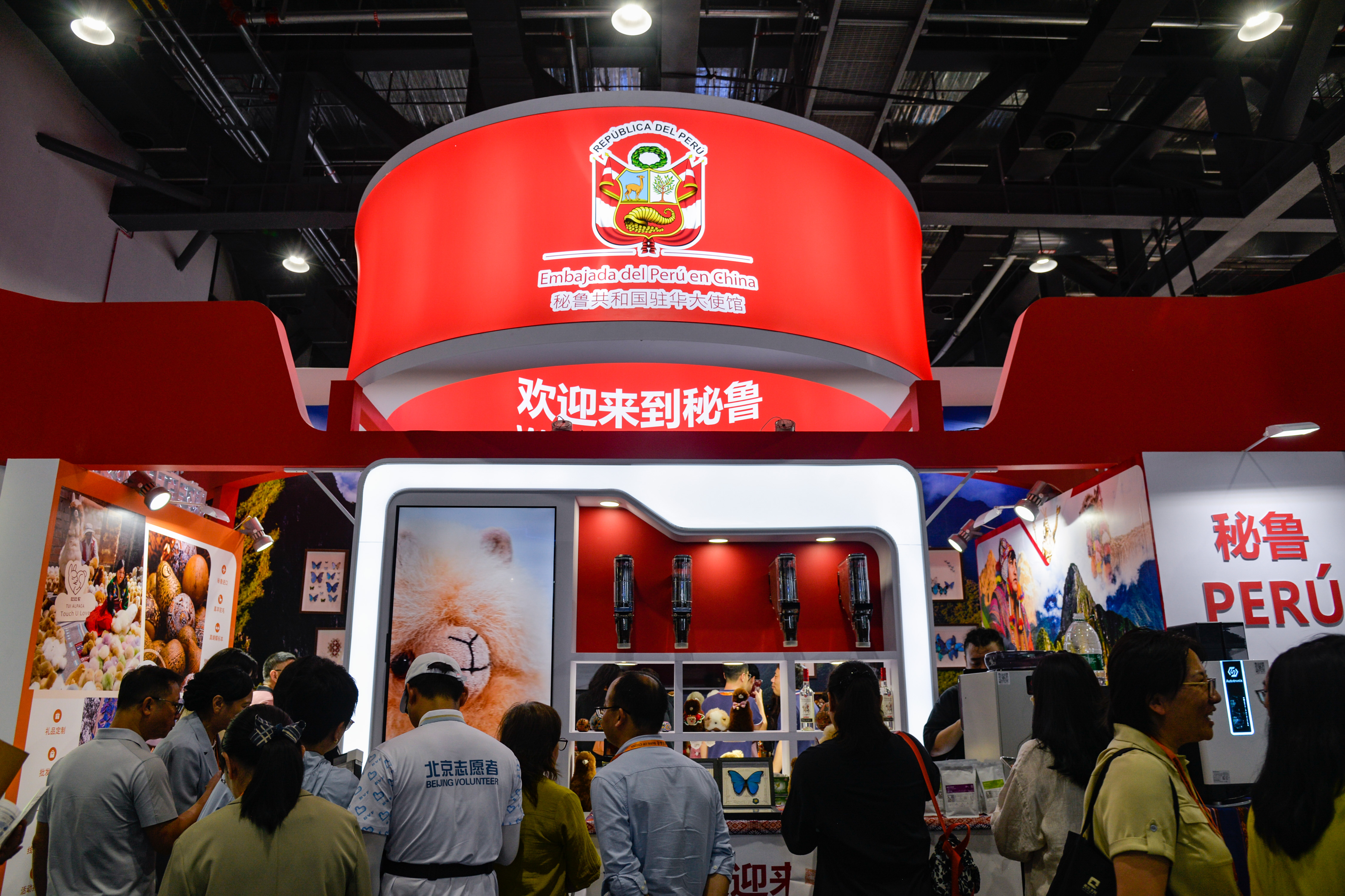参展者在2025年服贸会主题展秘鲁展台参观、咨询。新华社