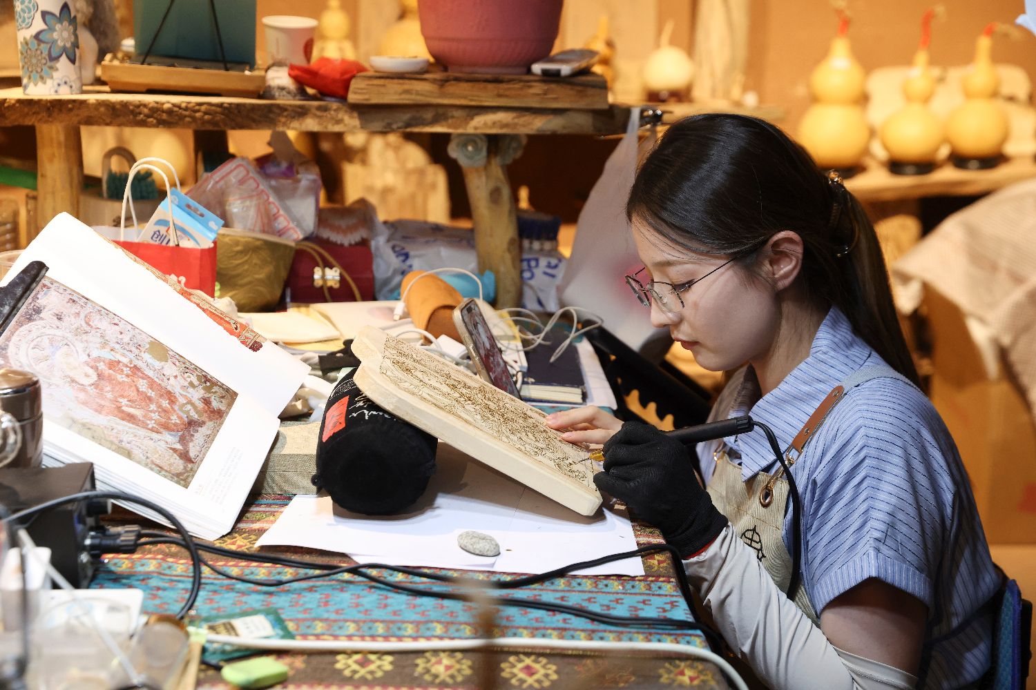 9月9日,在吐峪沟文旅小镇“克然木烙画艺术”工作室内,克然木·热扎克的徒弟夏提古丽·热合曼在练习烙画。
