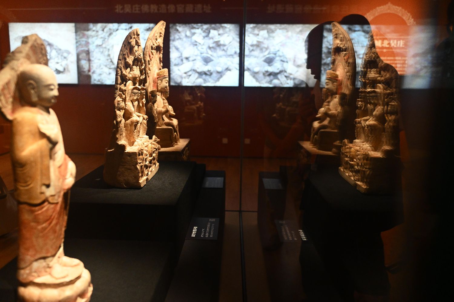 游人参观中国社会科学院考古研究所馆藏邺城遗址出土东魏(547年)藏品弄女造弥勒像。中新社