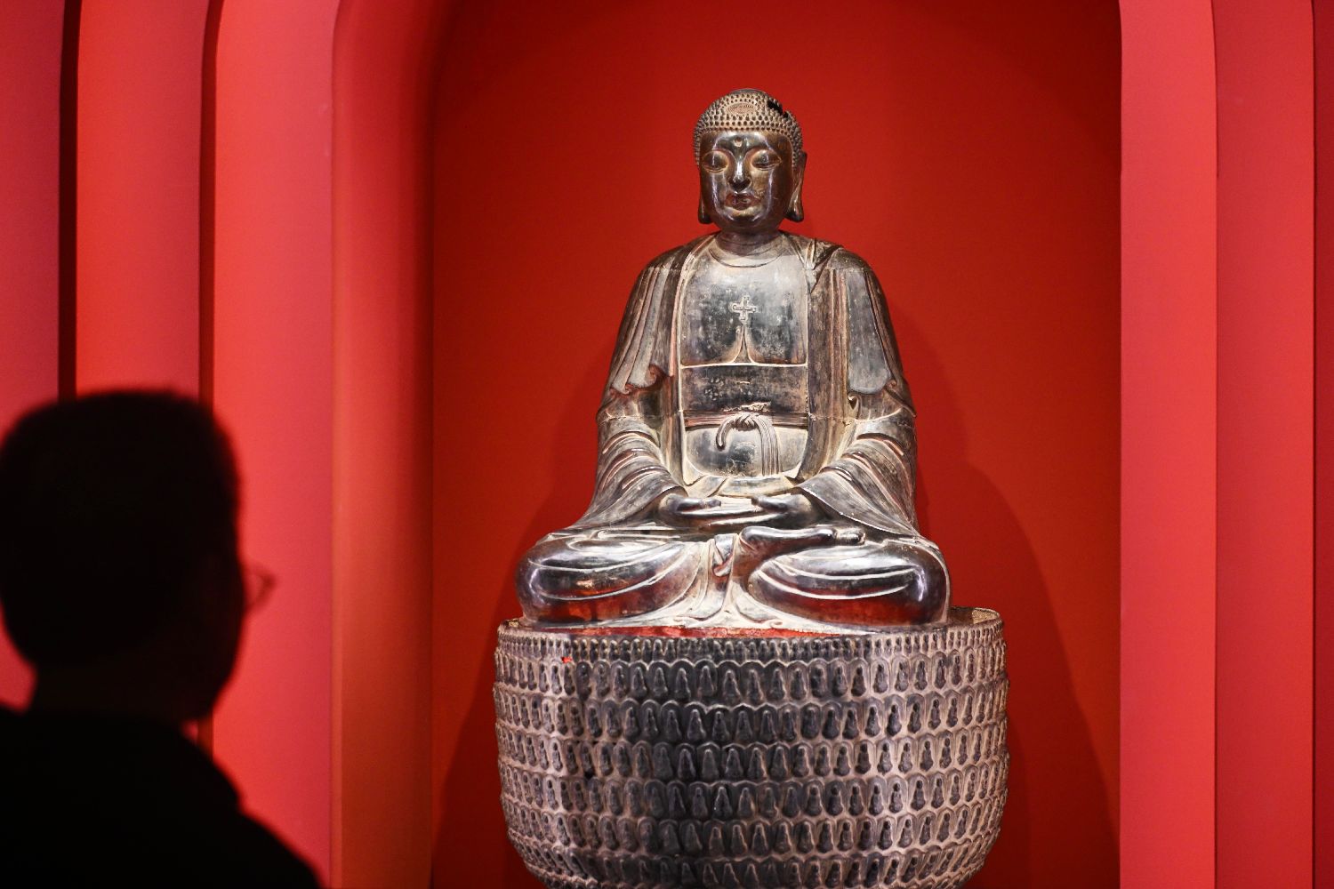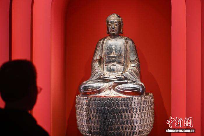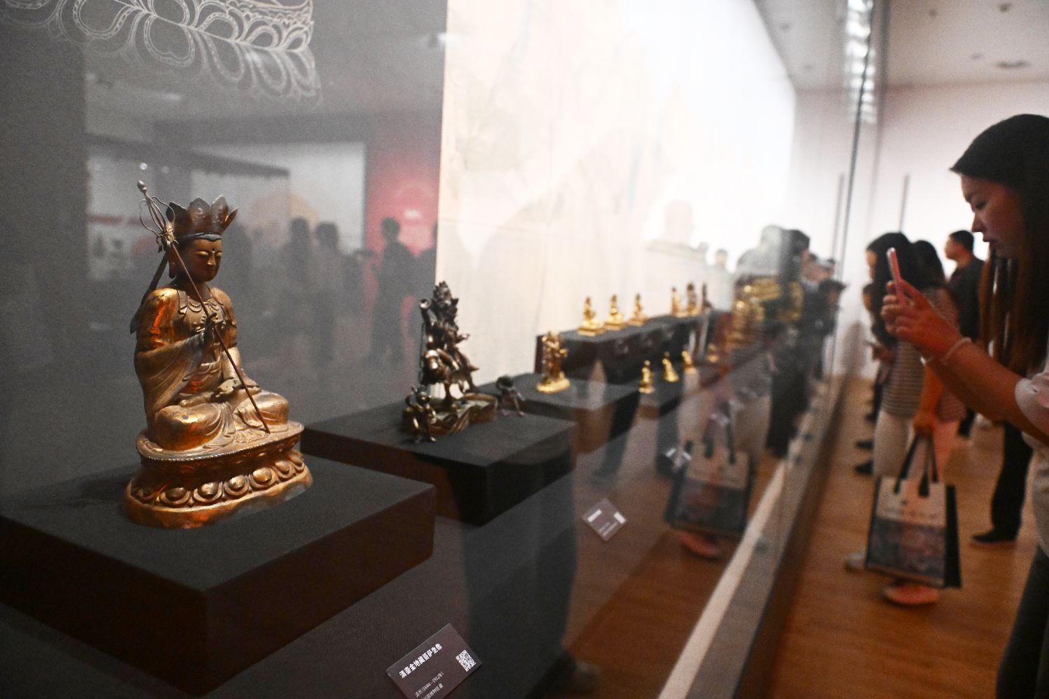 游人参观陇东古石刻艺术博物馆馆藏明(1627年)藏品千叶宝莲佛铜像。中新社