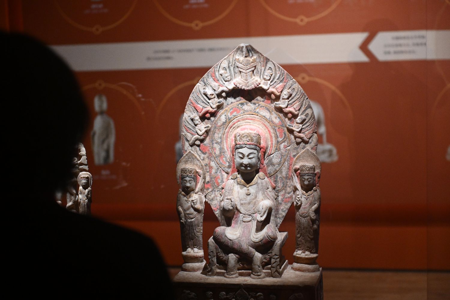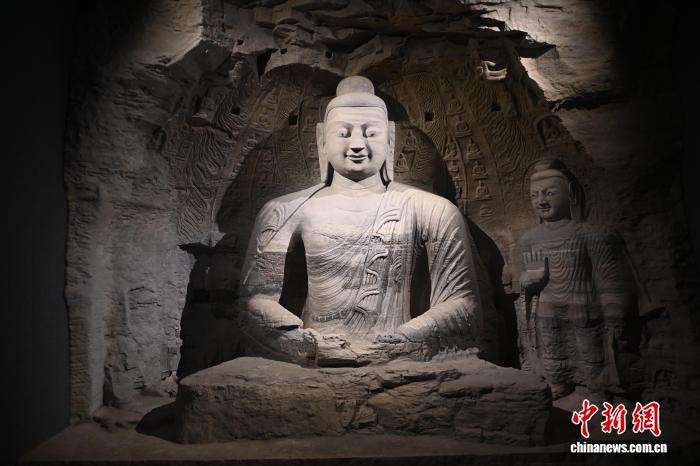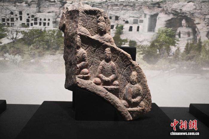 展览展陈的云冈研究院馆藏北魏(386-534年)藏品北魏残石雕龛楣坐佛像。中新网