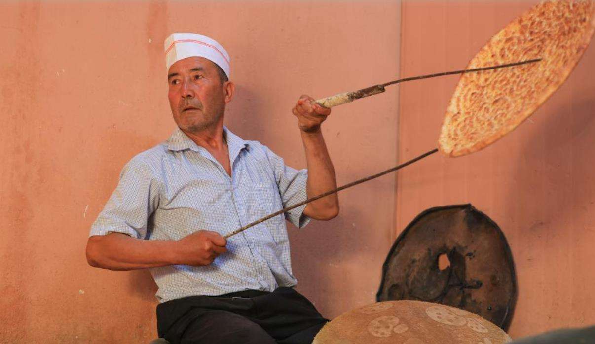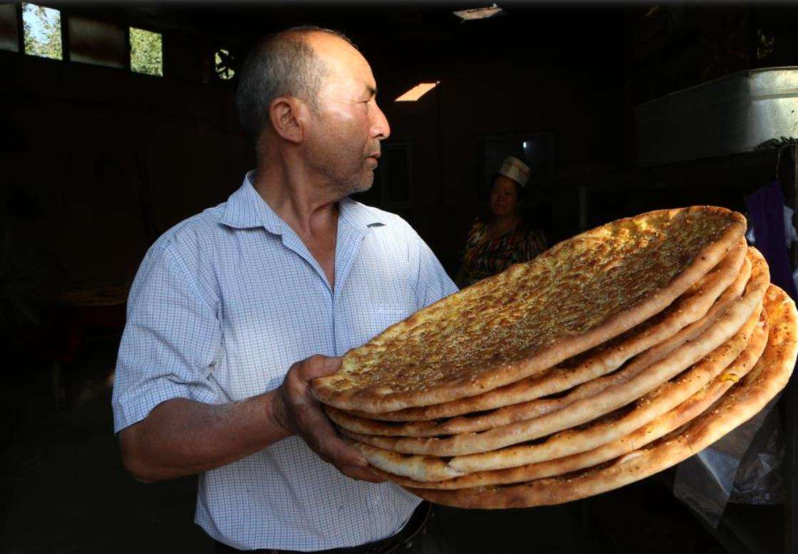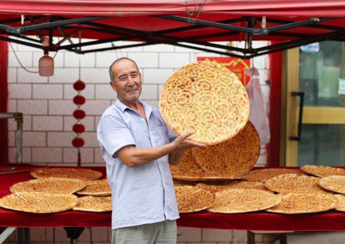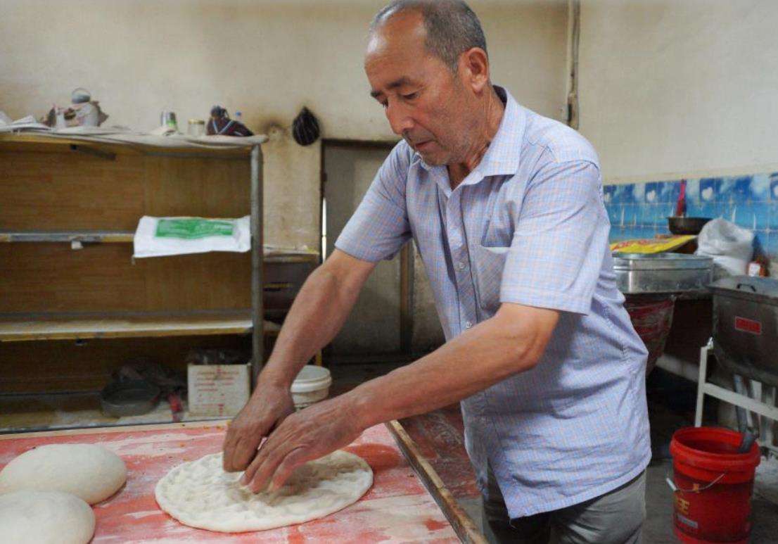 “宁可三日无肉,不可一日无馕。”一句新疆谚语,道出馕在新疆各族民众日常生活中不可或缺的地位。在新疆200多种馕里,库车大馕被誉为“馕中之王”,它大如车轮,平均直径超过半米,其馕坑口径和炉壁比其它馕坑更大,因而更考验制作者的技术。 今年65岁的热西提·依米提是传统面食制作技艺(馕制作技艺)中国国家级非遗代表性传承人,他从18岁起便和父亲学习打馕技艺,从祖辈手中继承下来的绝活儿如今又传给了自己的儿子。每天光顾热西提馕店的顾客络绎不绝,有当地百姓,也有慕名而来的四海游客。一天下来,热西提和儿子及徒弟打出的一两千张库车大馕,全都能销售一空。 图为热西提展示他制作的馕。