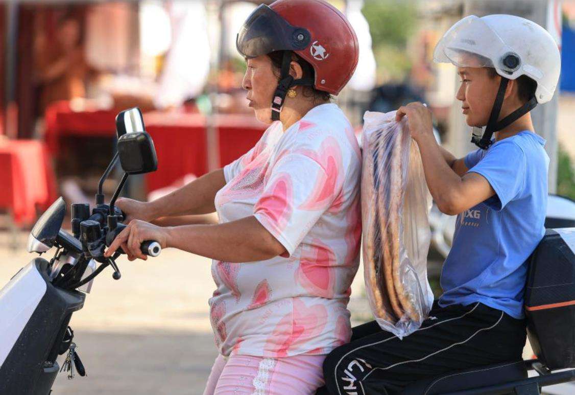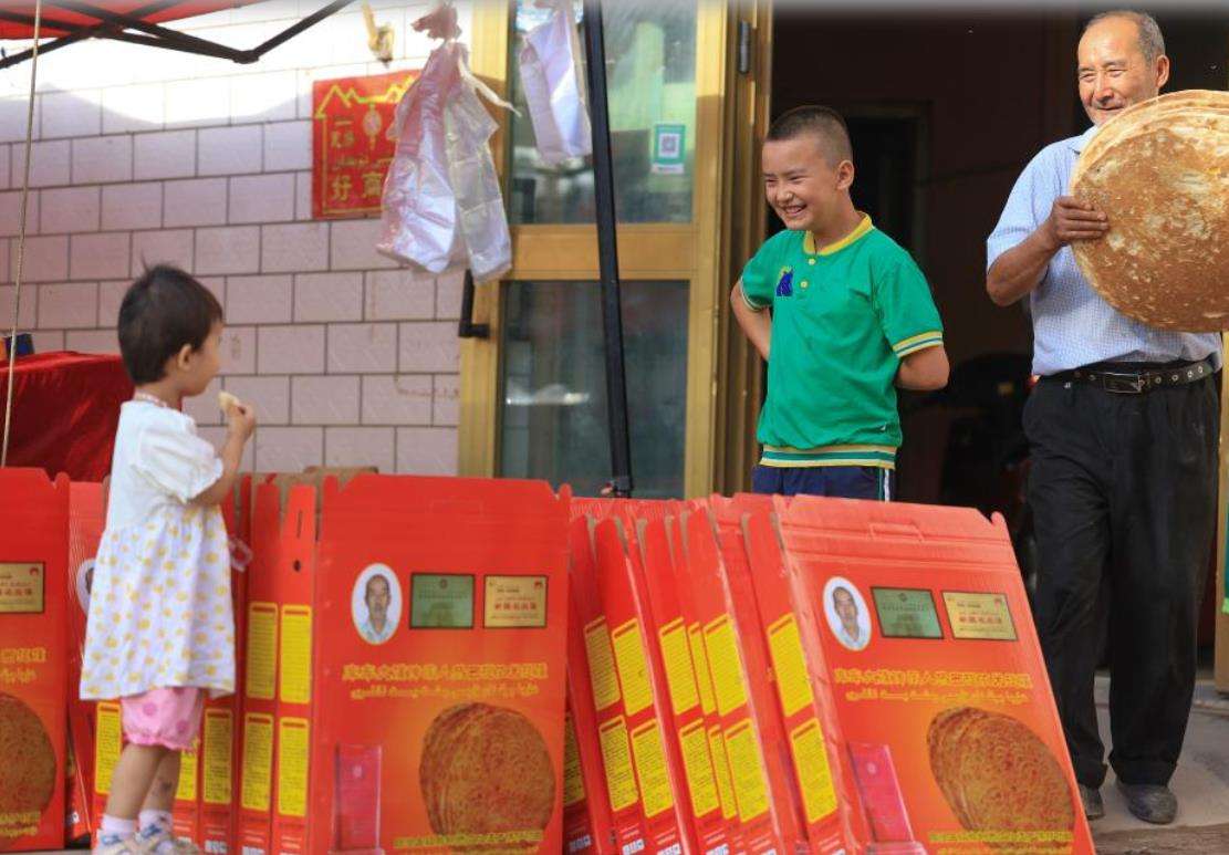 热西提(右)在自家馕店外哄逗孙子孙女。