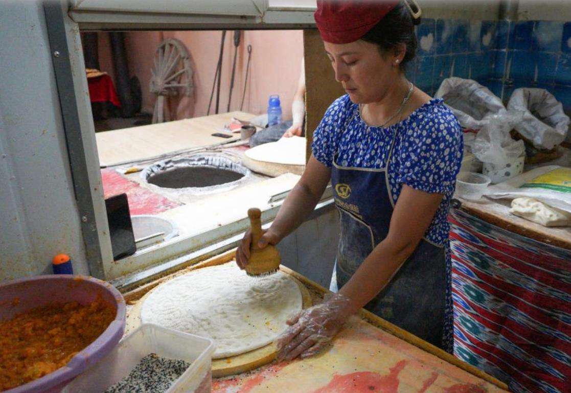 热西提的女儿里切木·热西提用馕针在馕上扎出花纹。