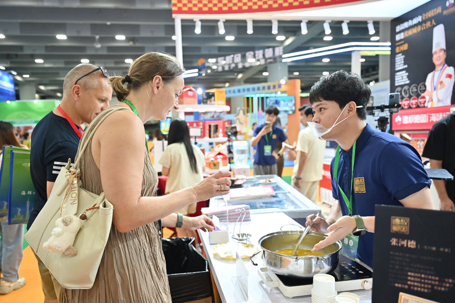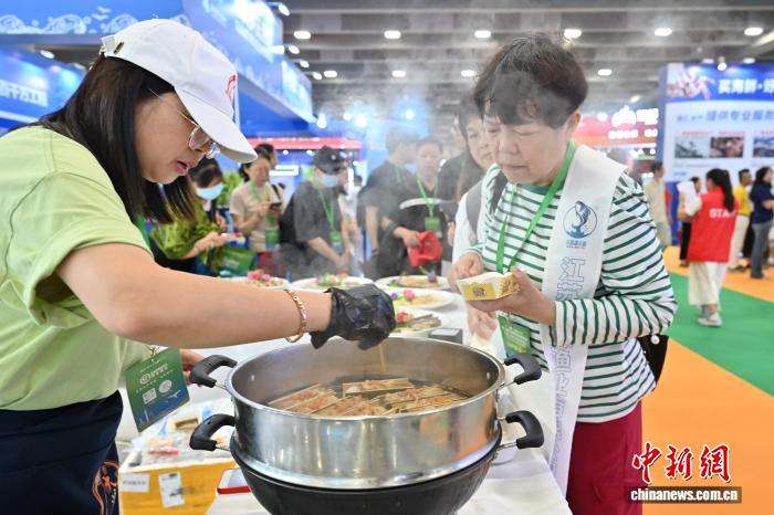 一展位的佛跳墙吸引采购商品尝。中新社