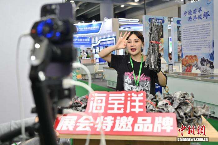 一展位的工作人员通过直播介绍海带。中新网