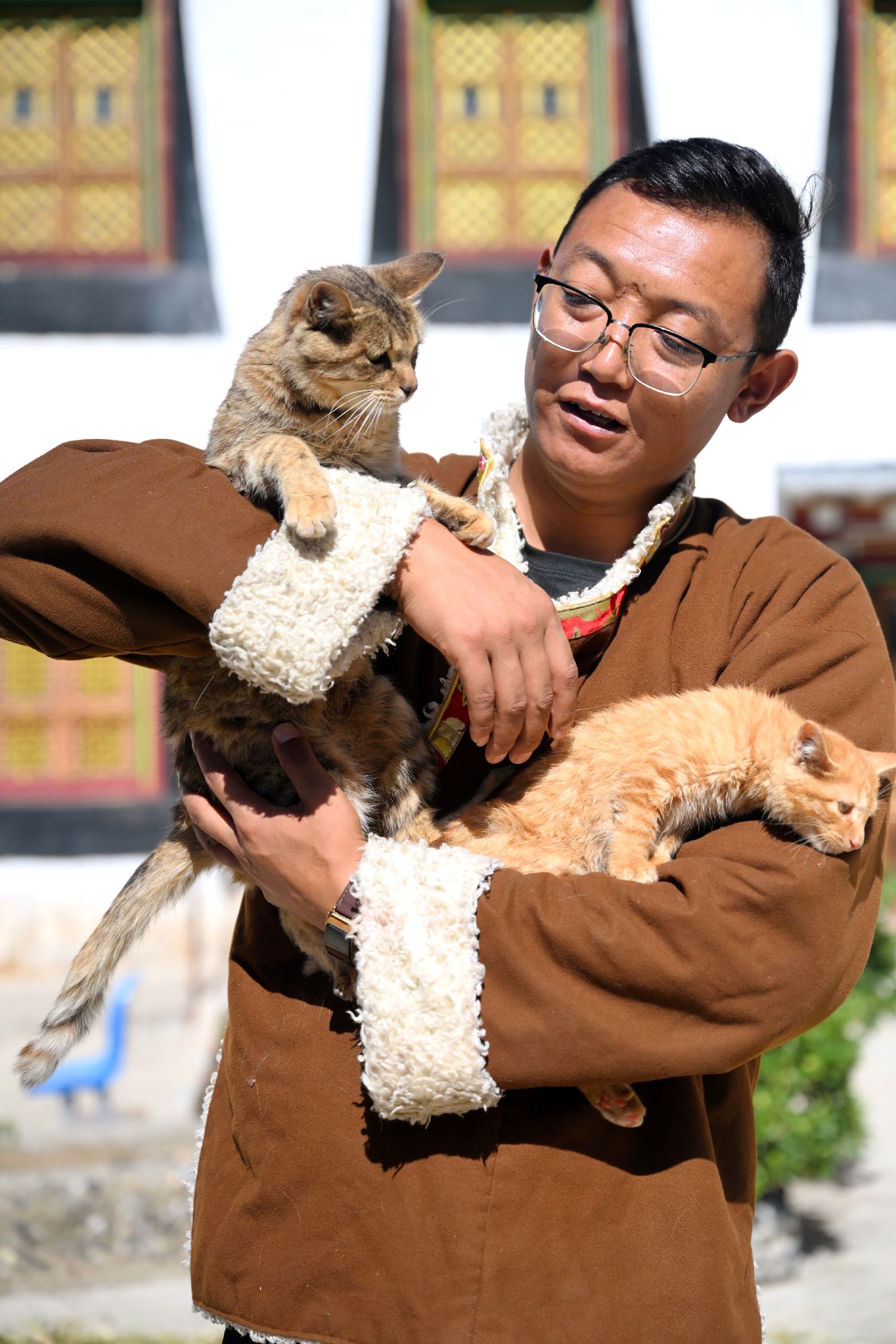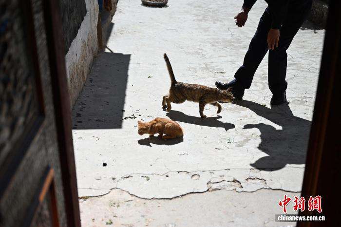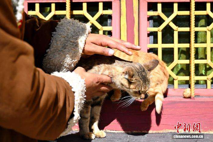 在四川省甘孜州乡城县这座川西高原的小城,长期以来形成了独特的敬猫文化,几乎家家户户都有猫,且倍受珍爱。无论是藏族民众家中还是在村子里,灶台上方的泥塑、瓷砖上的彩绘、外墙上的绘画、雕塑,总能寻见猫的身影。从守护粮食的“伙伴”到助力当地文旅的“符号”,敬猫文化已融入当地民众生活日常。图为9月15日,乡城县青德镇村民洛绒次称与猫一起玩耍。中新社