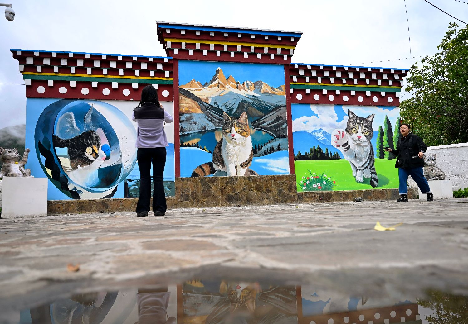 9月上旬,乡城县青德镇墙壁上的猫元素彩绘吸引游客拍摄。中新社