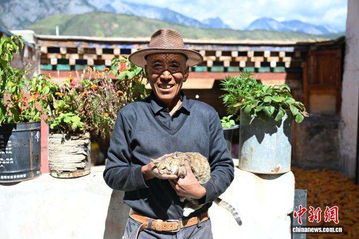 9月15日,乡城县洞松乡卡心村村民与猫在一起。中新网