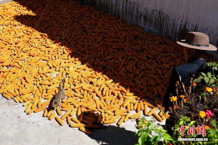 9月15日,乡城县洞松乡卡心村村民与猫一起在院子里。中新网