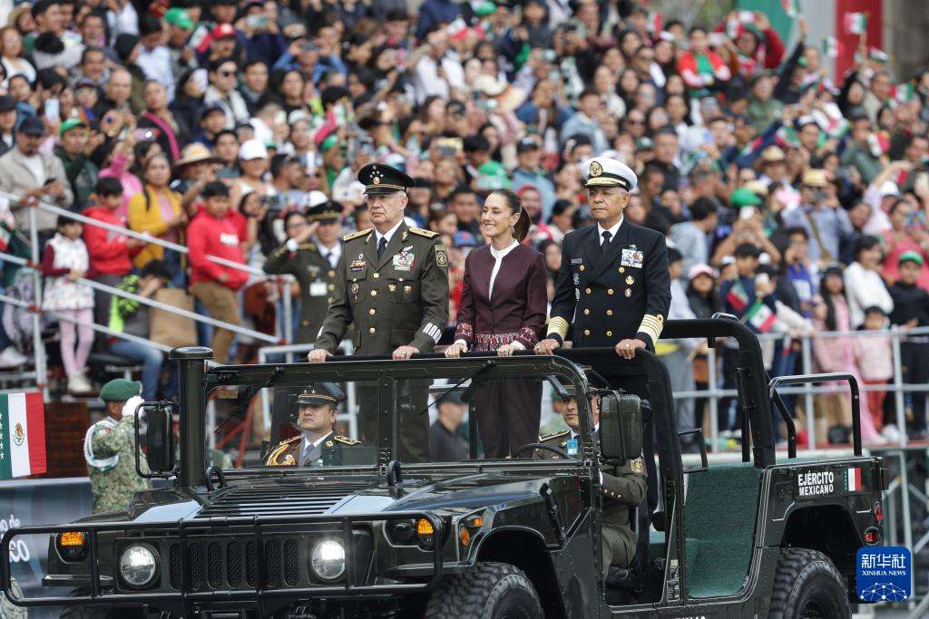 9月16日,在墨西哥首都墨西哥城宪法广场,墨西哥总统辛鲍姆(中)参加独立日阅兵。