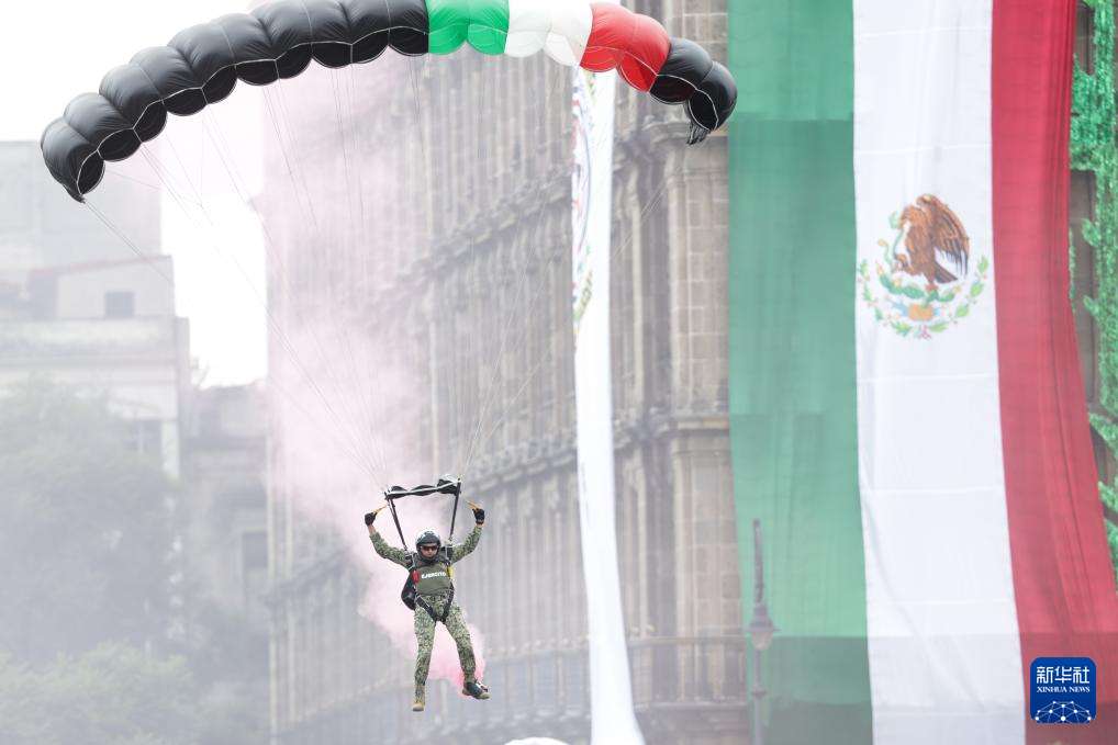 9月16日,在墨西哥首都墨西哥城,一名参加独立日阅兵的伞兵降落在宪法广场。