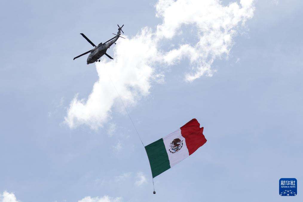 9月16日,在墨西哥首都墨西哥城,悬挂墨西哥国旗的军用直升机飞过宪法广场。