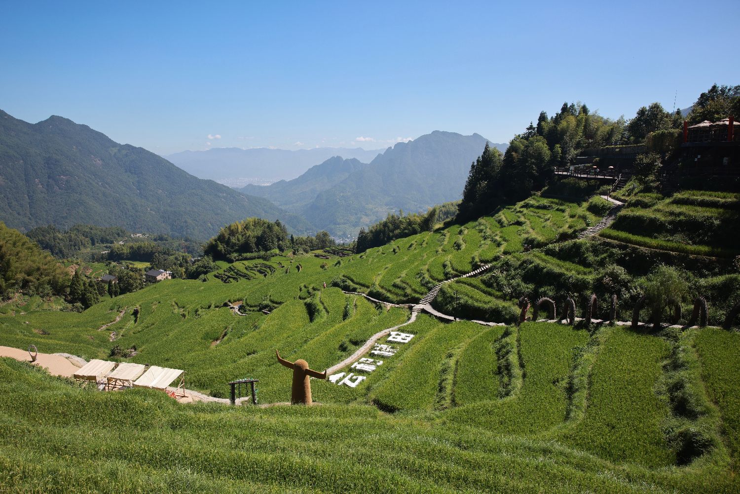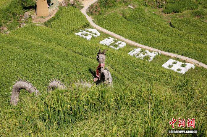 9月17日,梯田美景与巨龙装置相映成趣。中新网