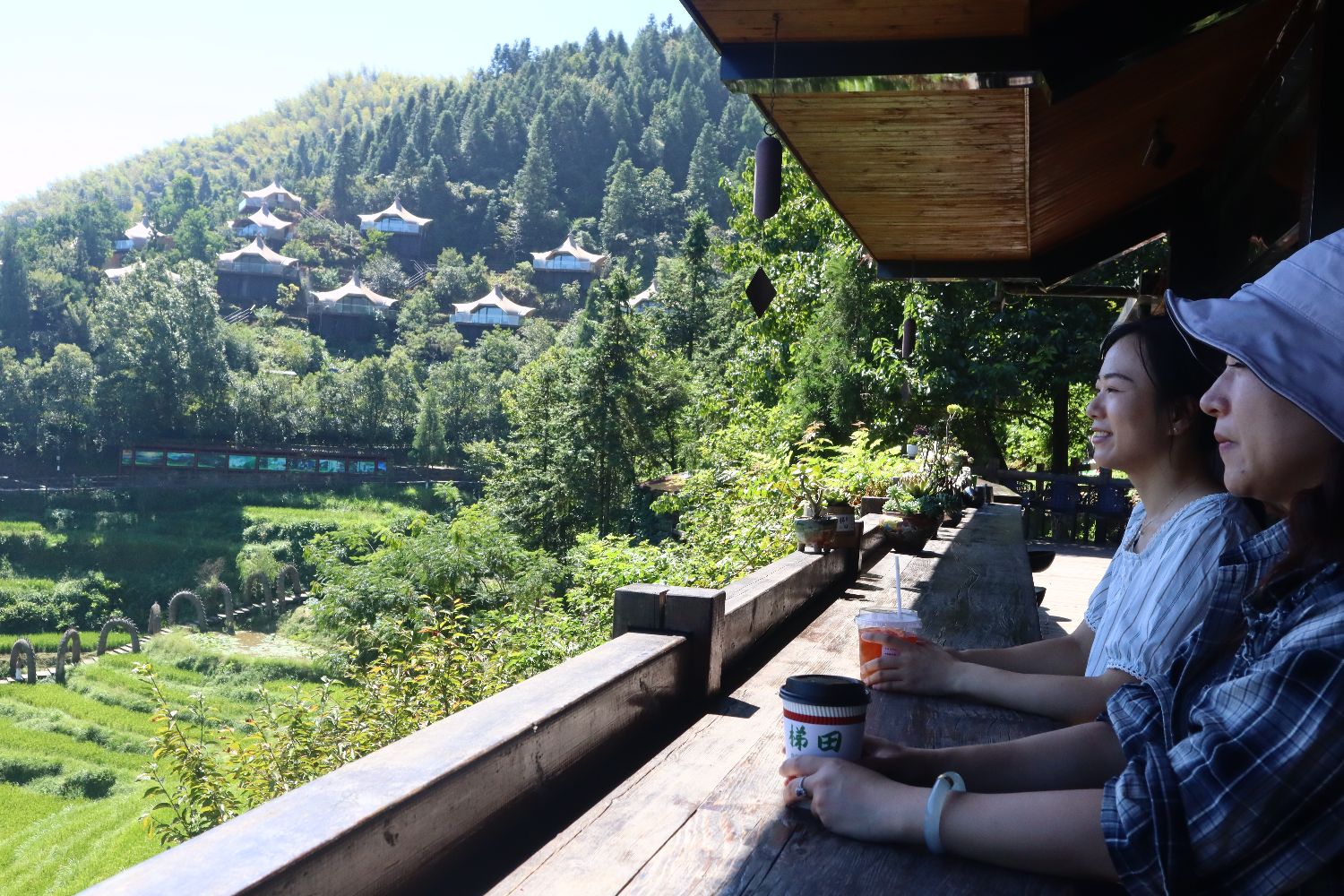 9月17日,游客喝“梯田咖啡”、赏窗外美景。中新社