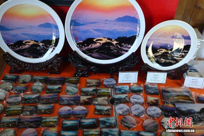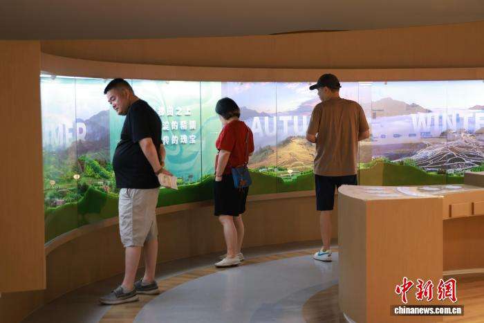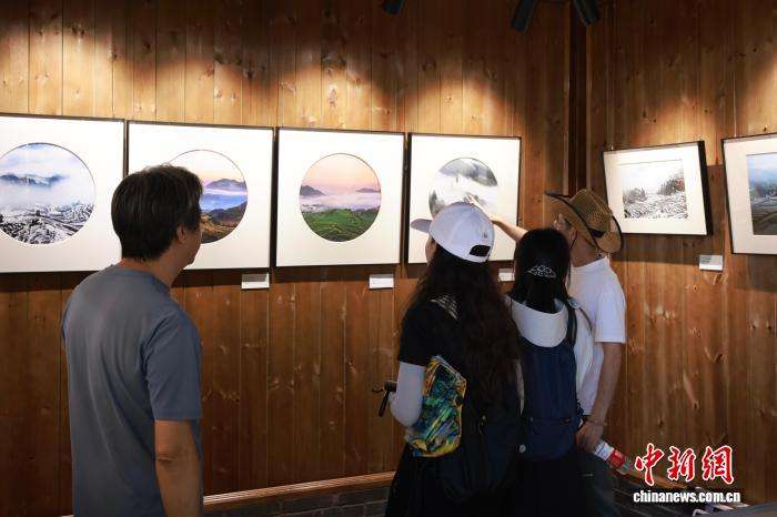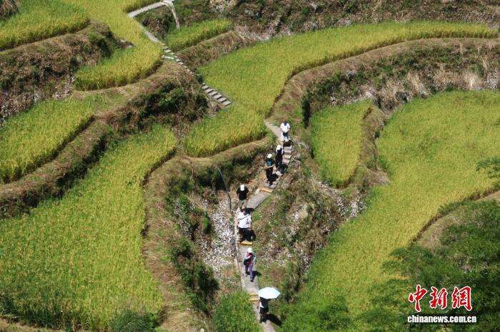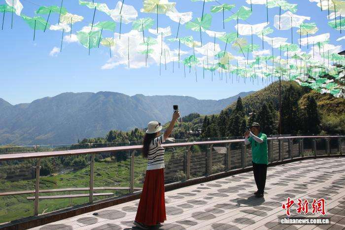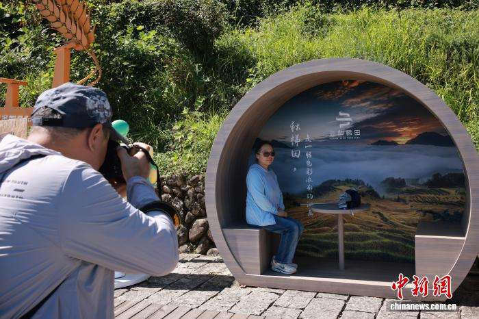 9月17日,游客在梯田旁的休息区拍照打卡。中新网