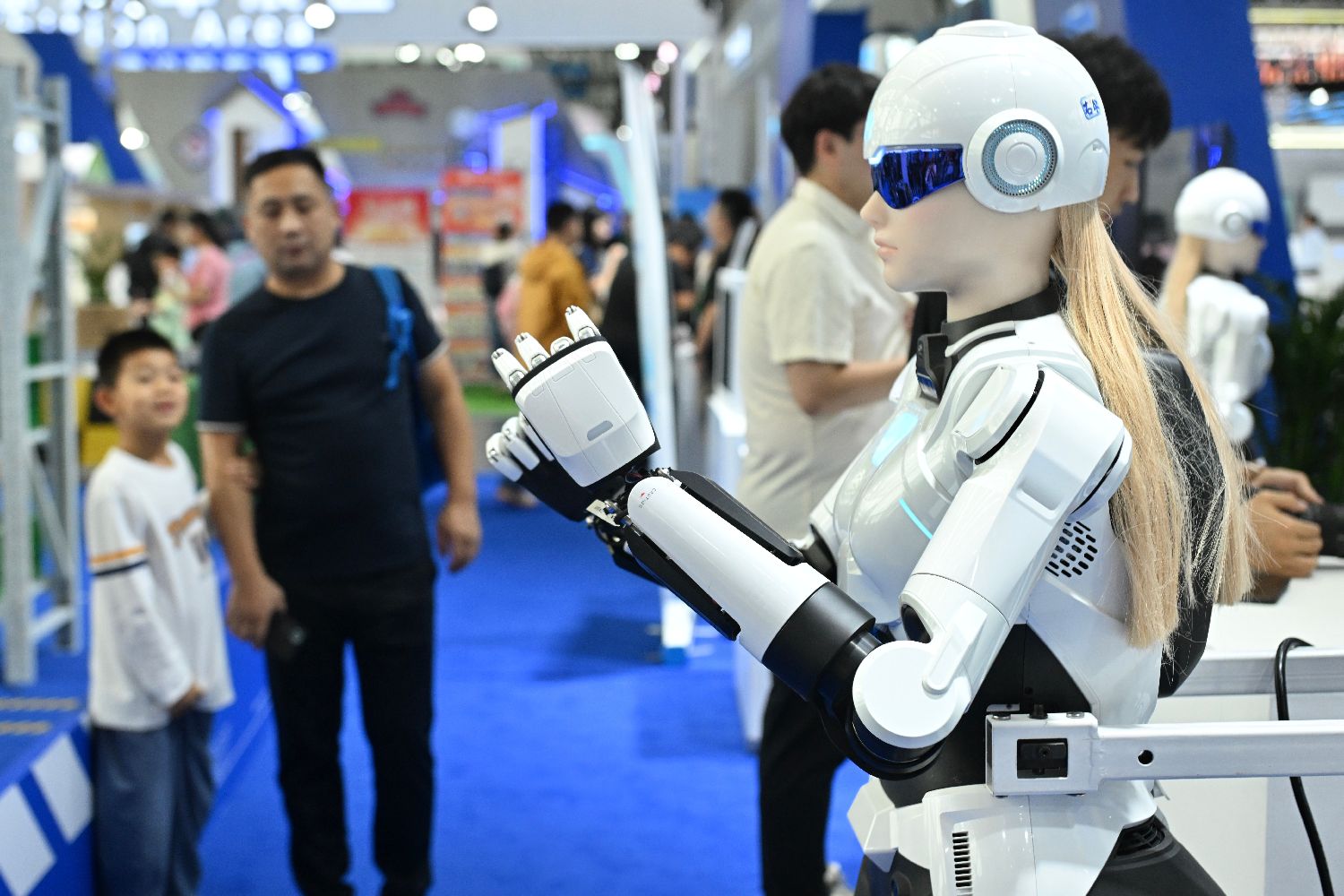 9月20日,以“智造世界・创造美好”为主题的2025世界制造业大会在安徽省合肥市开幕。展会上,人形机器人、智能科技产品等集中亮相。图为观众在智能机器人展区参观。中新社